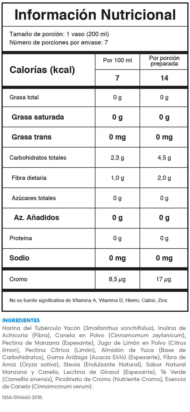 YACÓN + FIBRA PREBIÓTICA + CANELA + LIMÓN + TÉ VERDE+ CROMO