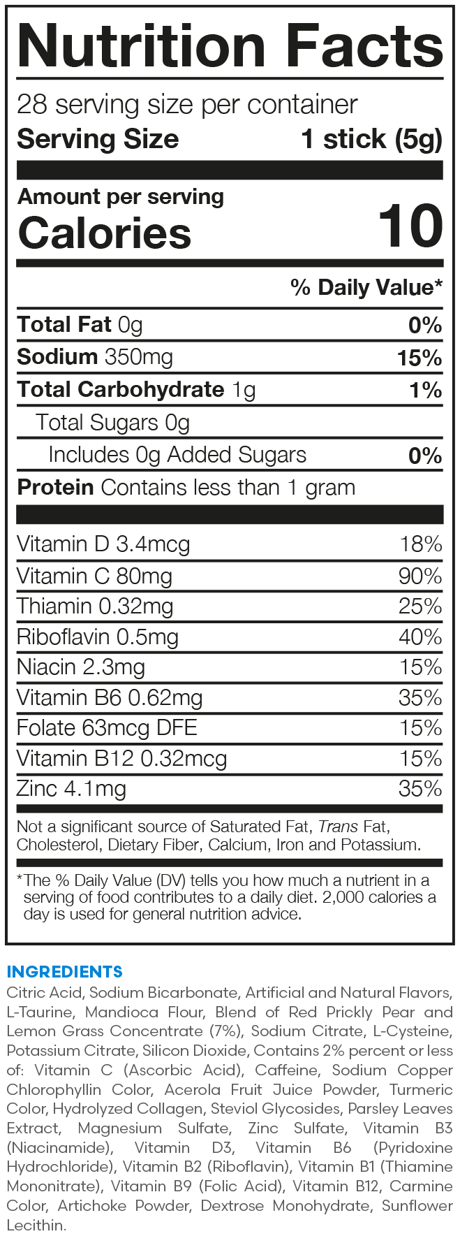 PLANT EXTRACTS MIX (RED PRICKLY PEAR, LEMONGRASS, CHLOROPHYLL, ACEROLA, TURMERIC, PARSLEY, ARTICHOKE), PEPTIDES AND AMINO ACIDS MIX: HYDROLYZED COLLAGEN, TAURINE, CYSTEINE, VITAMINS AND MINERALS MIX: B COMPLEX (VIT B1, B2, NIACIN, B6, B9 (FOLIC ACID), B12), MAGNESIUM, ZINC.